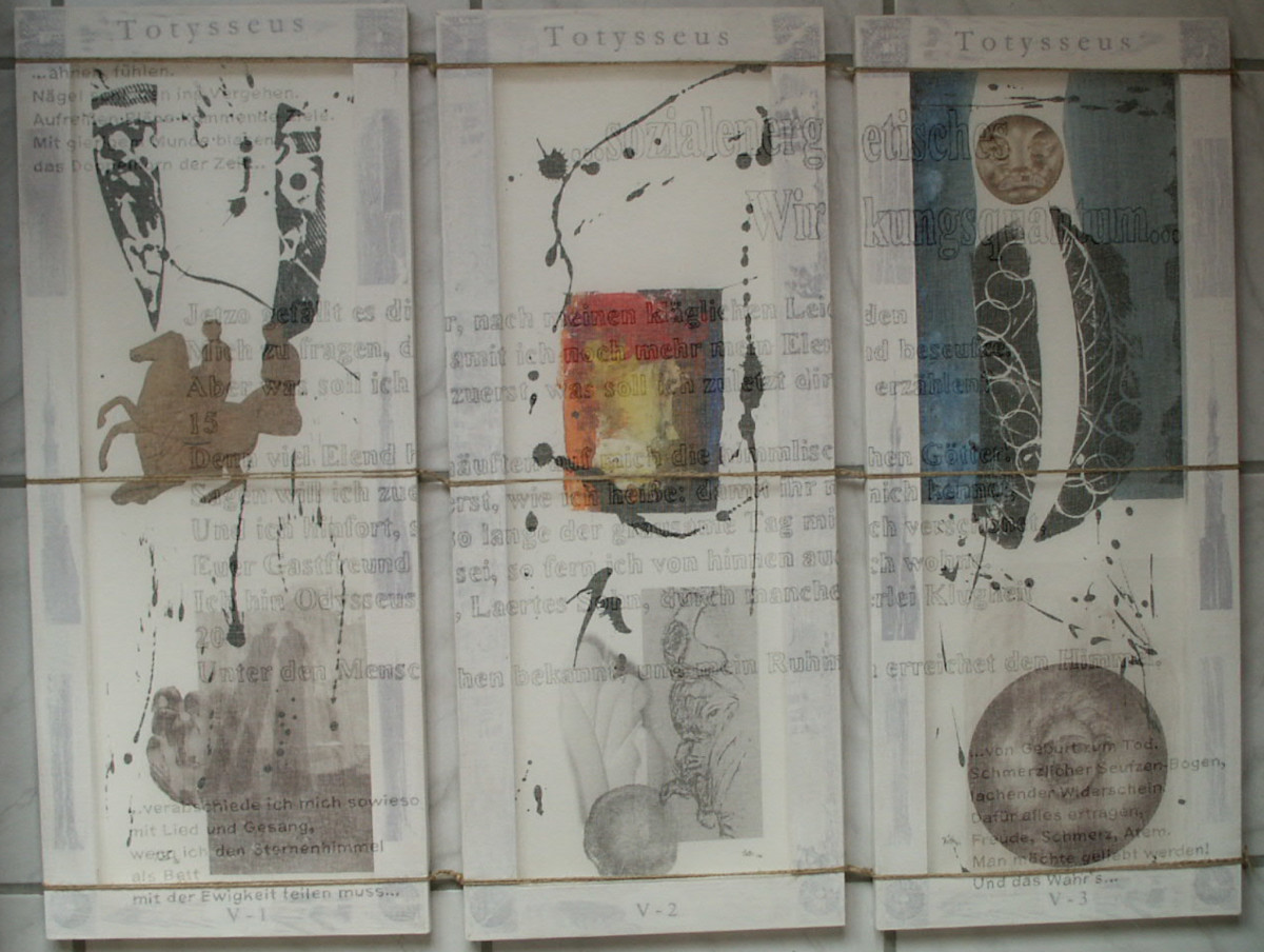 Totysseus Vagabundis 2000 – 2015 Leitmotiv: Imaginäre Wanderungen. Verschmelzung von Bild und Text, ein nomadisches Erzählen in visueller Form. Rolle: Ego als Künstler Ort: Eigene Galerie und Partnergalerien Collage, 25x70cm Collage, 25x70cm Collage, 25x70cm Collage, 25x70cm Collage 25x70cm Assemblage, 80x70cm Assemblage, 80x70cm