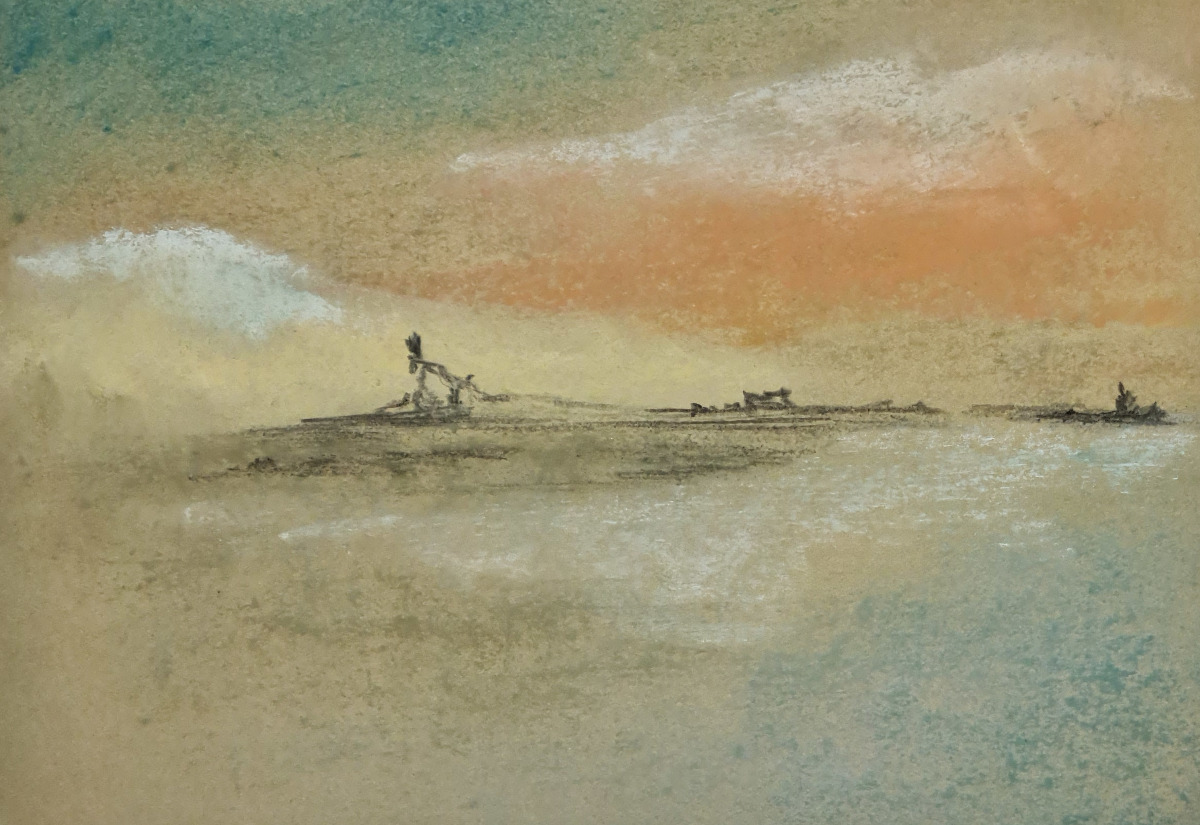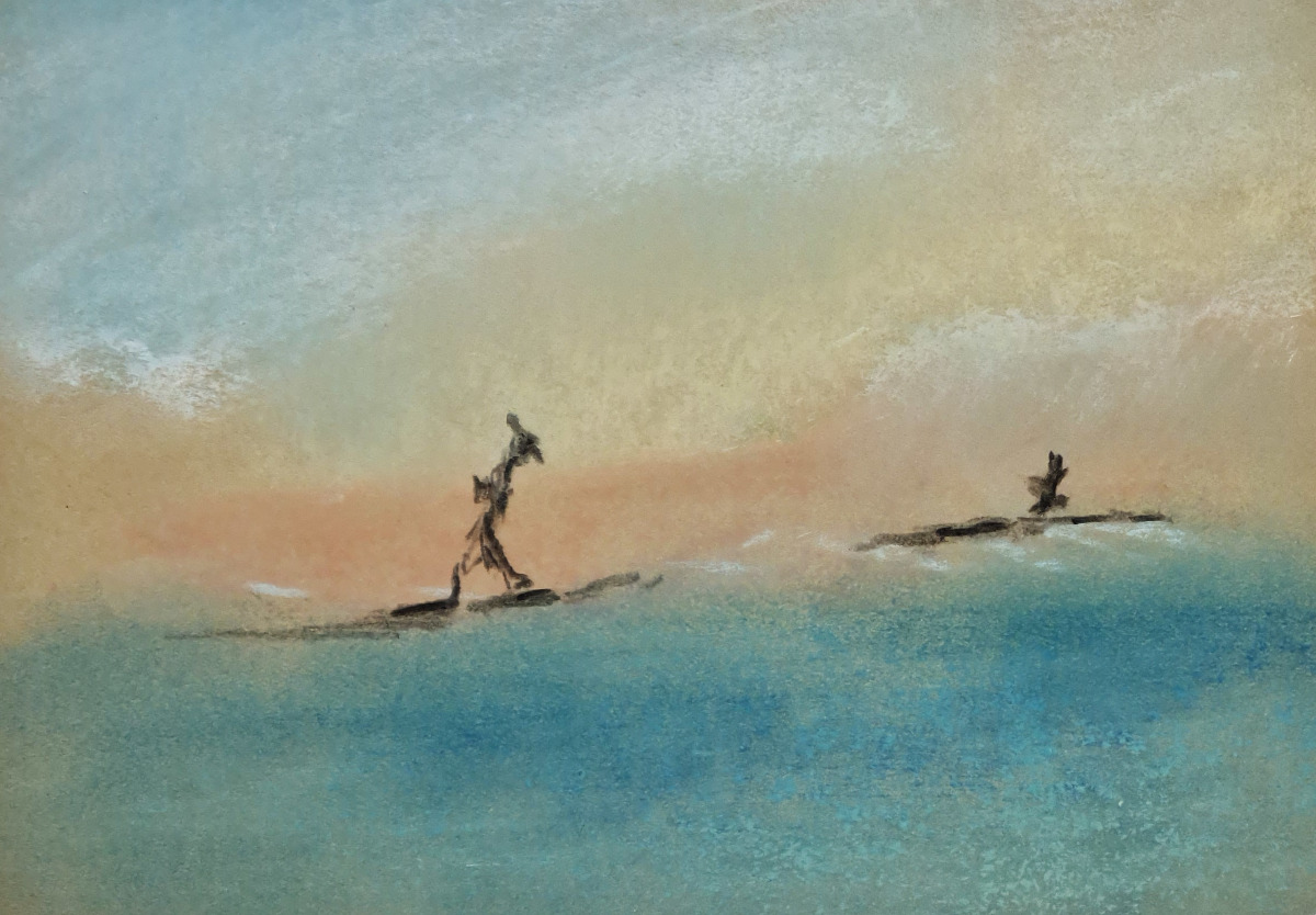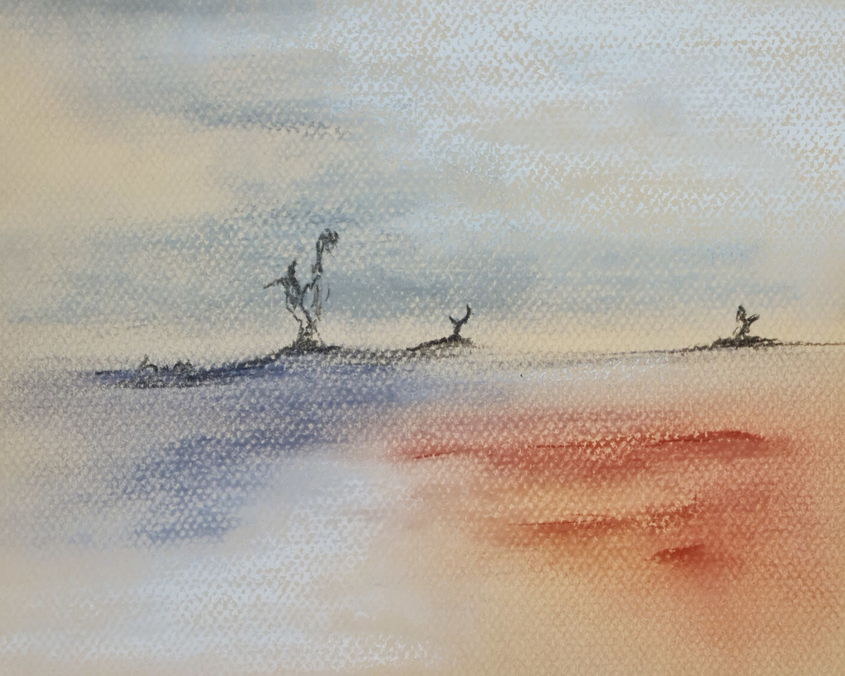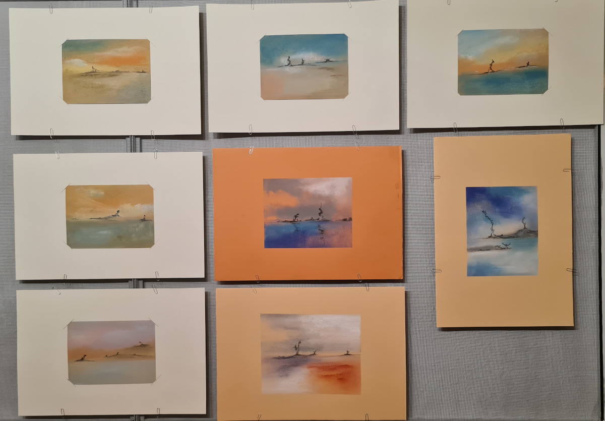 - Leitmotiv: Mensch in der KI-Ära. Fragmentarische Reflexion des Menschen in der KI-Ära, verbunden mit einer bewussten Rückkehr zum Handwerk durch verwendung von Holzkohle und Pastell.